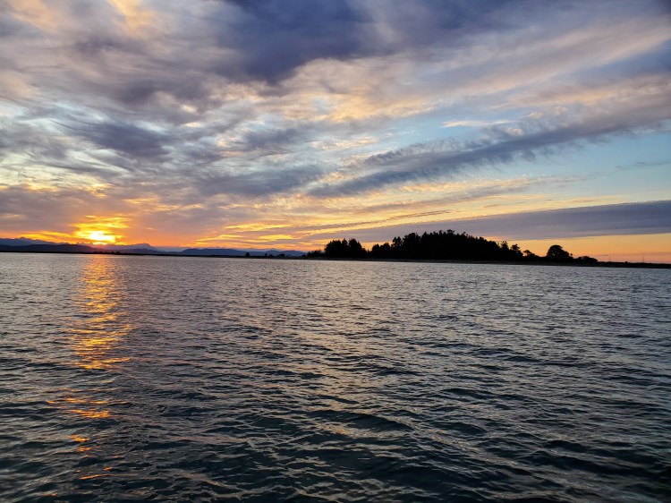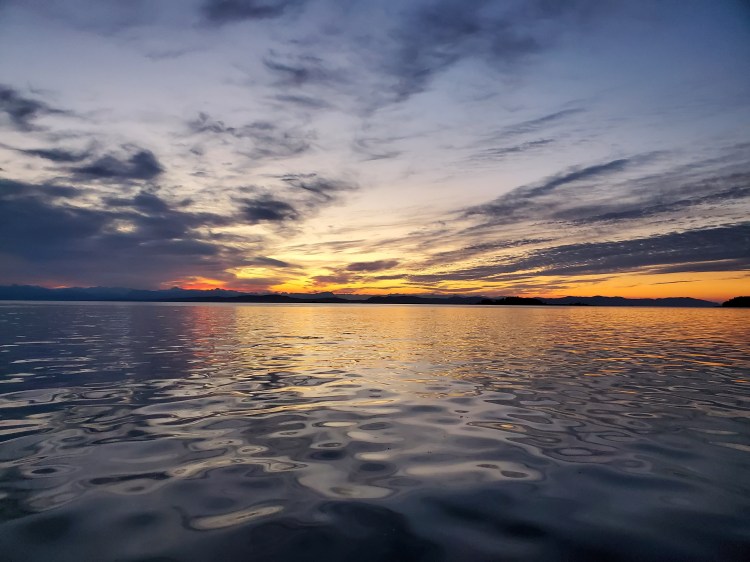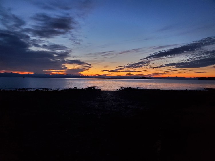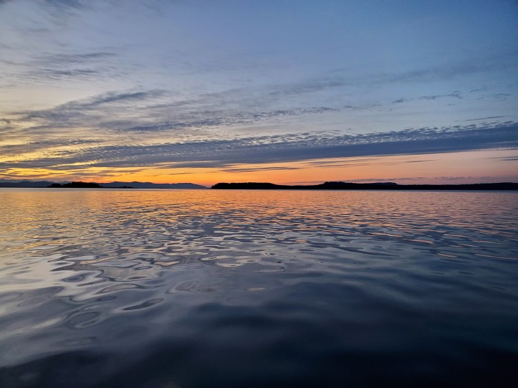 I quickly went down to the water to survey the conditions and launch site. Both were on point, so I went to my vehicle to get my kit in order. I packed light, a few bars and gummies, iced water (the last few days have been hot early in the day), and some emergency tape (duct and electrician’s). I was on the water by 0525 hours in time for the first light festivities. Below is the view from the water at the bottom of Argyle Road with the islands silhouetted just right of the image centre.