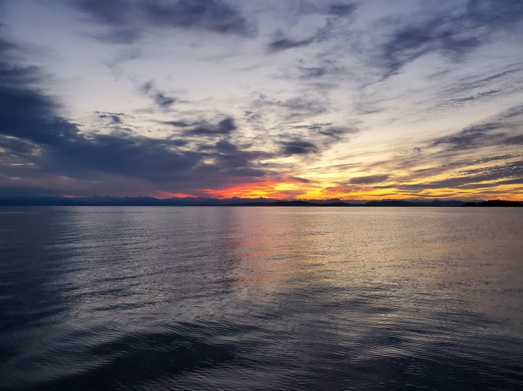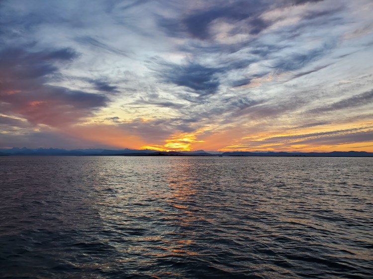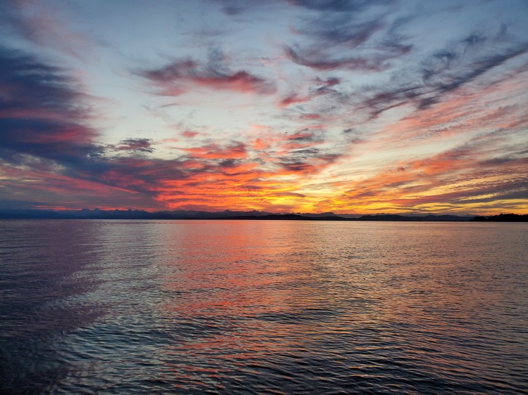 The winds were mild, and the waters were calm as I set out. But as the sky took on a crimson hue, I couldn’t help but recall my adventure on the Sound (Átl’ka7tsem, Howe Sound) with Trevor last summer and the old sailor’s adage regarding red skies. When crossing the Lions Gate Bridge, the skies had a red hue that would be an omen of foul future weather.
