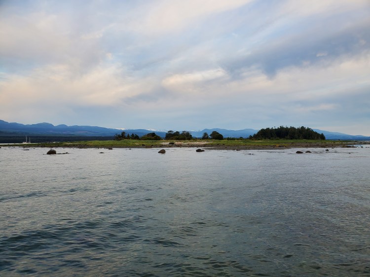 I made my way across to the other end of the bay. But eventually, my fins bottomed out. Rather than run the risk of seeing if I could cross closer to Longbeak Point, I decided to suptage (SUP portage) across the sand, rocks, and shells. I felt slightly bad for the marine life. However, I rationalized my actions with the knowledge that the journey between Denman Island and Jáji7em and Kw’ulh Marine Provincial Park is advertised as a walk along the tombolo at low tides on the BC Parks website.