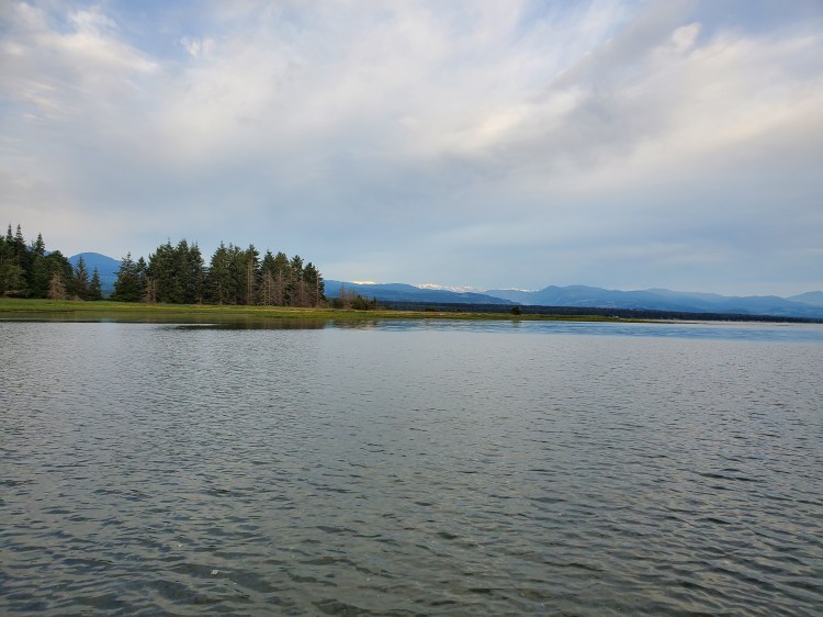 Shortly after taking the photo above, I noticed some movement behind me off of one of the islets. Two deer sprang from the shores into the shallow waters before swimming across to the southern islet. I scrambled to fish my phone from my flow-fending-fanny pack for the fun fawn fording but could only capture the swim and scramble to shore on camera. With the backlit recording, it is hard to make out the cervinae, but they are in the video below. Somewhere lost in the light at the start of the video, but you can see them a bit more easily exiting the water on the right near the end of the recording.