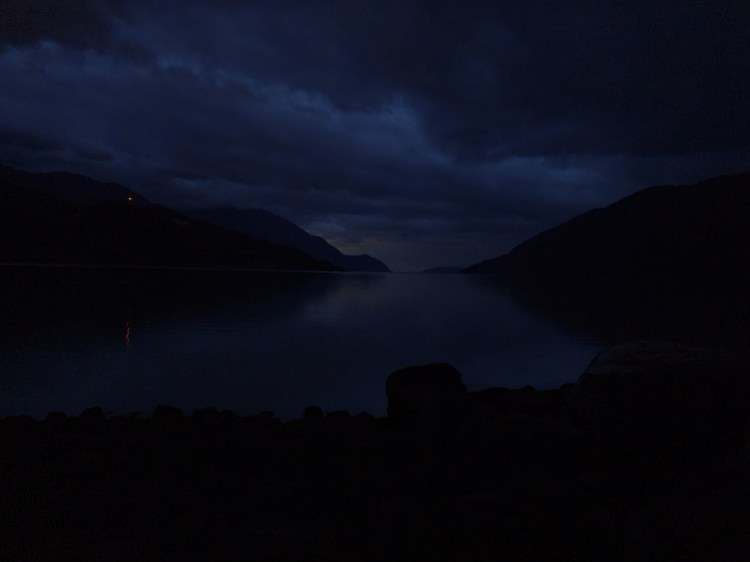 By dinner time, the weather was in fine form. The cloud cover made for some spectacular colours. I enjoyed dinner from the comfort of my Karrimor cushion-lined log on the shore of the pebbled beach and took in the scenery.