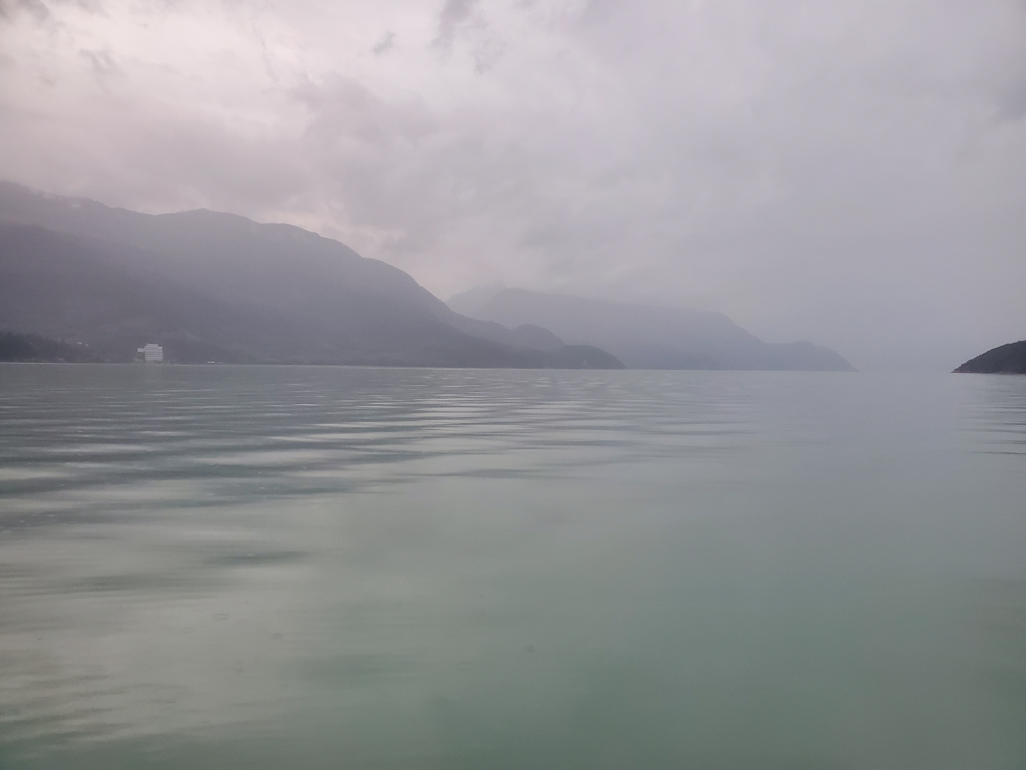 I aimed more or less toward Watts Point, with the ultimate destination for the first leg of Zorro Bay. The rain picked up out on the water, but it was warm enough that I didn’t want my rain jacket. The images below are of Britannia Beach, the west side of the fjord, and the view back toward Squamish over Watts Point.
