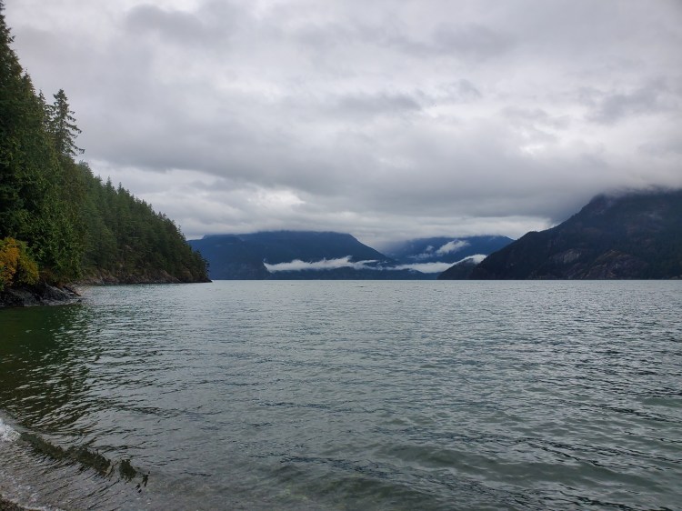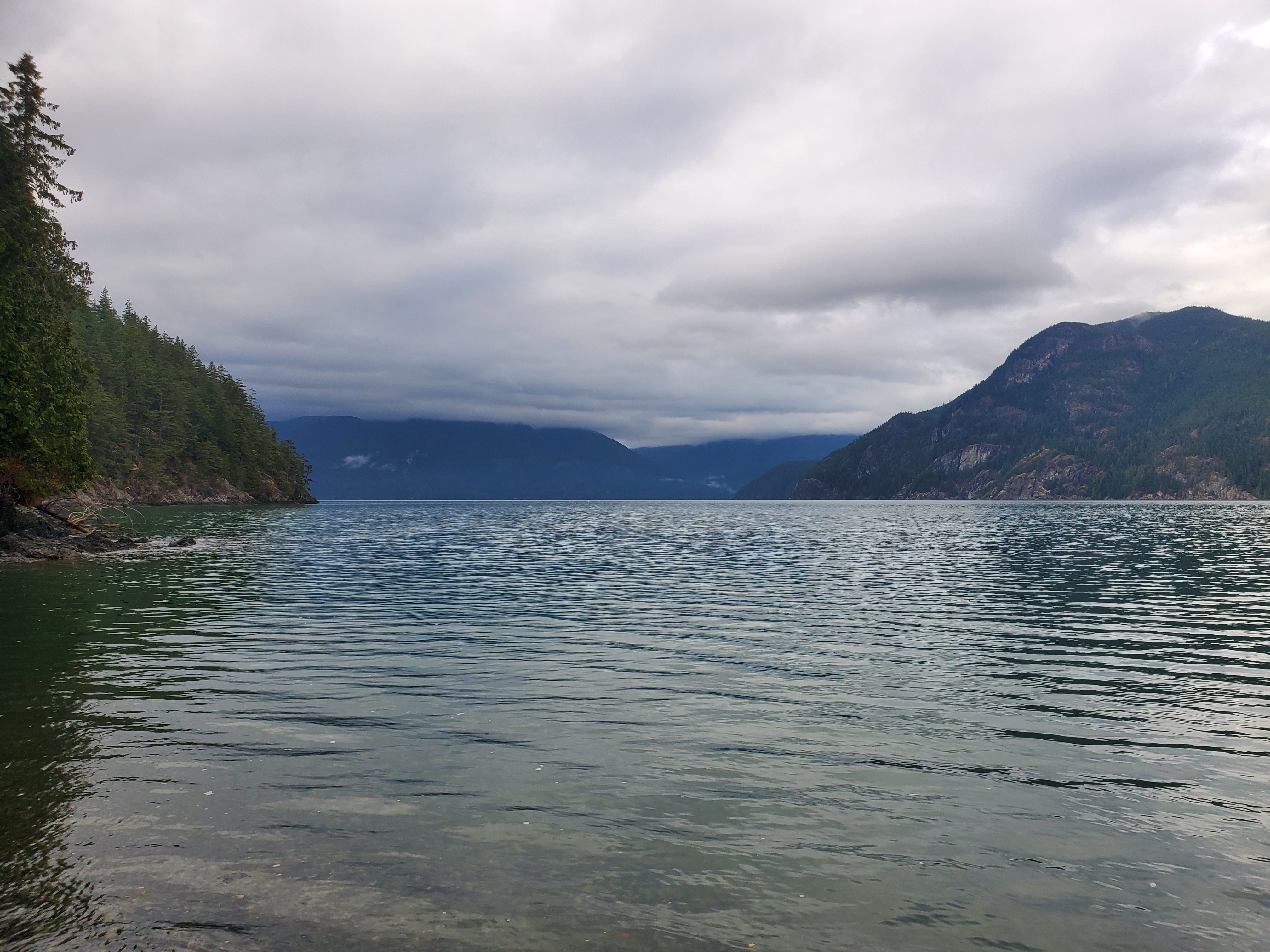 The thought of winds roused me from my morning musings. I couldn’t hear any wind outside. I checked the forecasts on Windy.com and the Government of Canada’s Howe Sound Marine Weather Forecast. They hadn’t changed. I was still likely going to encounter inflow winds. I just hoped that they would be mild. That was the motivation I needed to get out of bed. I quietly packed up my tent belongings, so as to not wake my neighbours, then made my way out into the twilight to break camp. I used the red light setting of my headlamp to maintain my night vision and not notify my neighbours of my presence. In order to navigate the forest path, I used the green light setting, which I had previously discovered worked well in woodlands by accident. I recently read about the distinctions between the different light colours, which corroborated my forest finding.