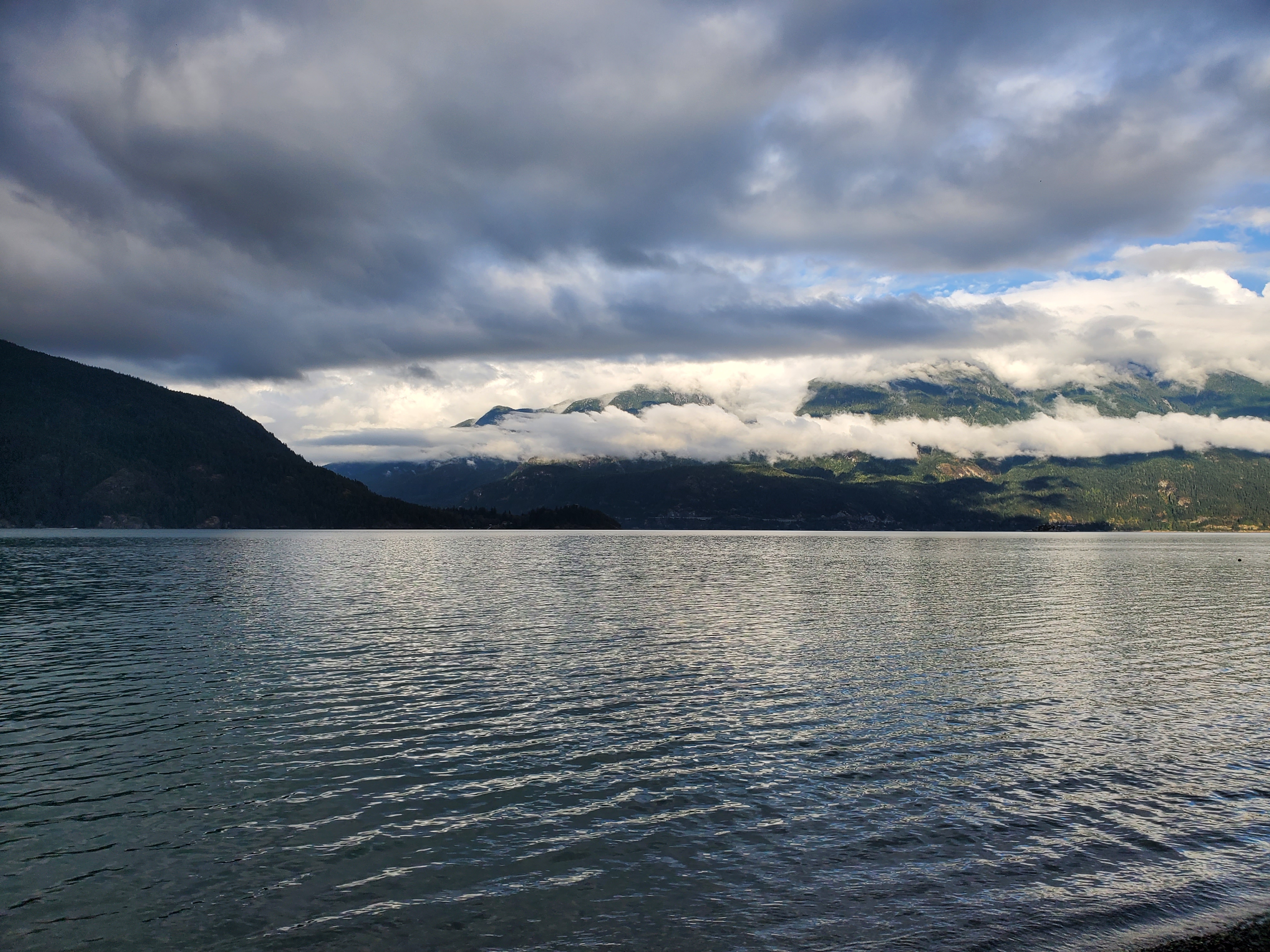 By the evening, the skies were starting to clear. The radio weather forecast was calling for southerly inflows again. Without cellular reception, I couldn’t get any other details from any other weather sources. I would trust the forecast and my observations. Given the breaks in the cloud cover and glimpses of blue sky, the weather looked more favourable for the following day. The first image below is the view over the southern side of Lhaxwm (Anvil Island), where things were starting to clear, followed by the view north, where the cloud cover hadn’t quite cleared yet.