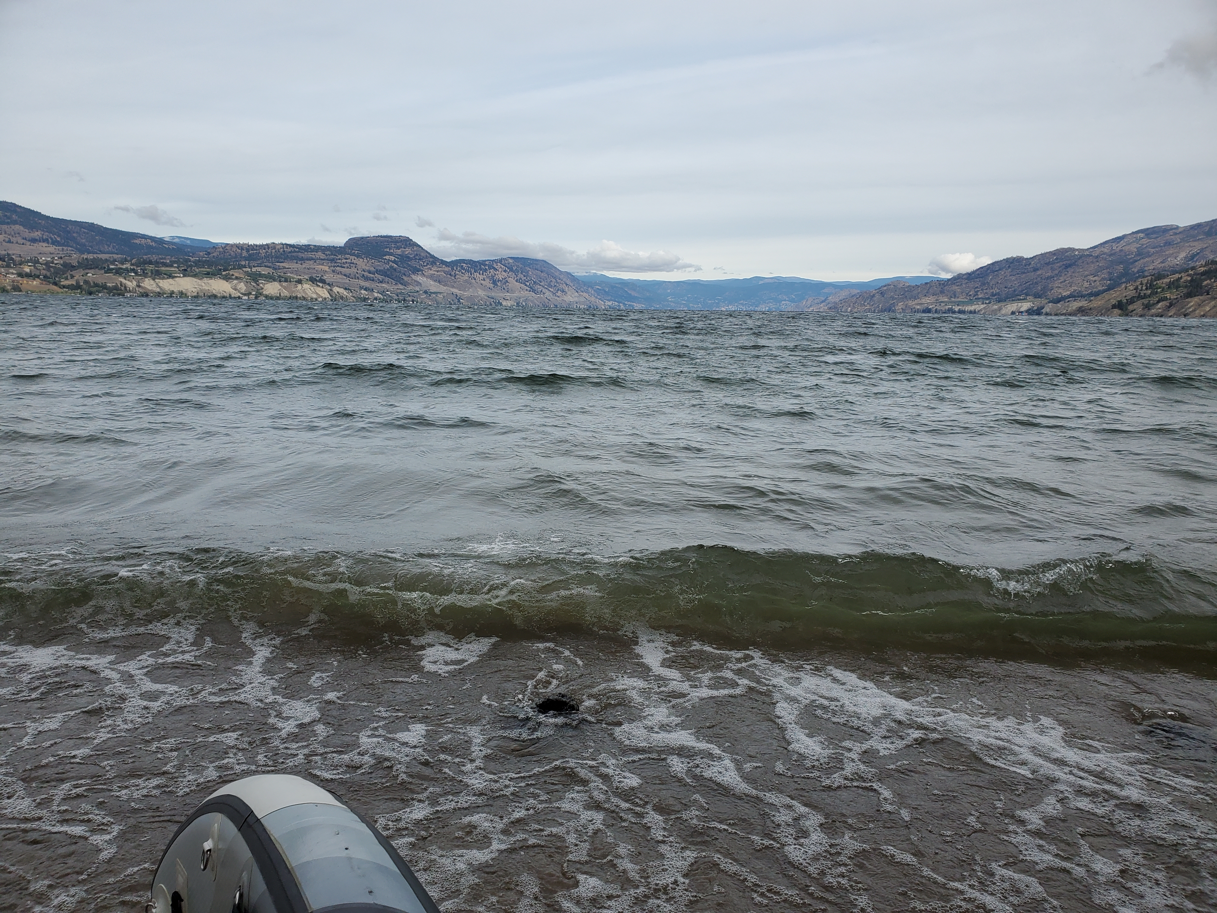 Later, after my paddle, I would discover that the flag flapping in the wind was, in fact, from the Naramata fire station. But at present, I just saw a Canadian flag flapping southward, signalling northerly winds and somberness for the sovereign. With my monoculars, I could confirm the lake state with a bit better accuracy of the wave heights from my distant vantage point. Next, I confirmed with friends that if I launched from Naramata, they could pick me up in Penticton, so I could downwind one way. The logistics were that I had their vehicle from the night before and now would head to their accommodations at the Naramata Inn to drop off their vehicle and launch from nearby.