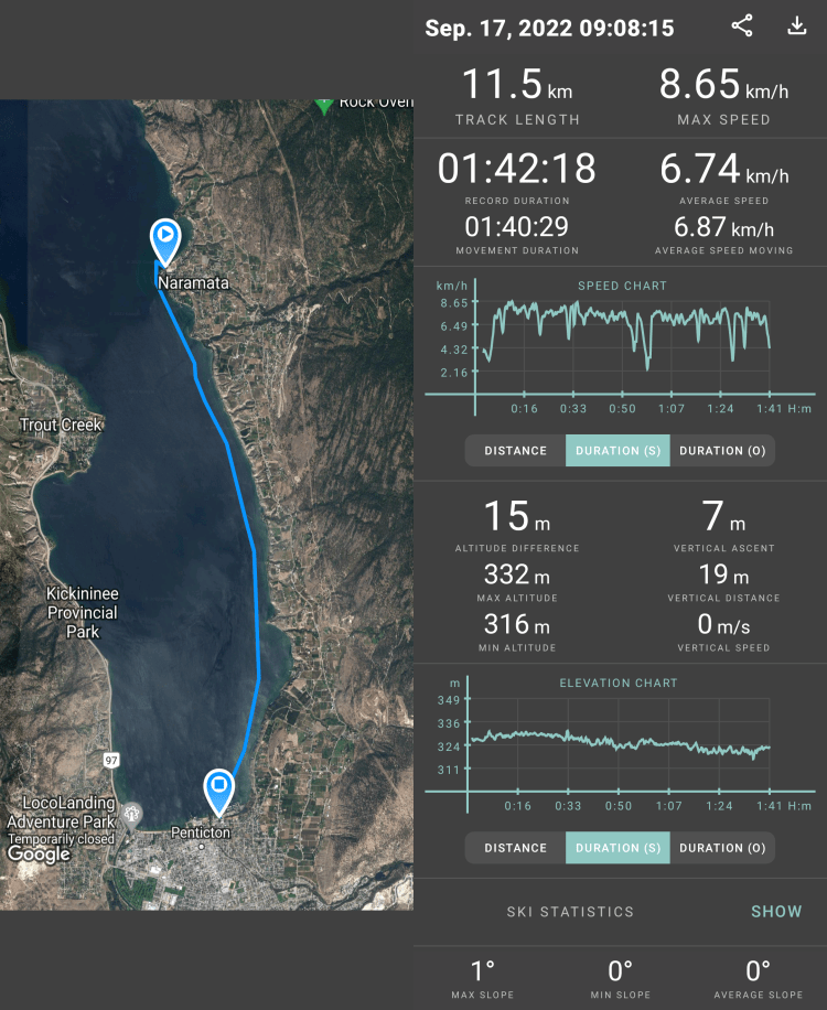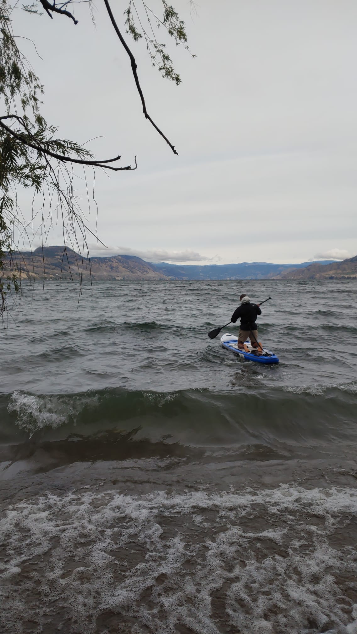 There was another great section of water just past the narrowing of Gartrell Point. But after that section, the winds seemed to settle until I neared the shore at Penticton. The image below looks south to Penticton from just north of the Bench 1775 Winery. I made contact with my friends to confirm a pick-up point. I recalled SUPing several summers ago with my kids at Marina Way Beach, so I suggested there as our rendezvous. In hindsight, I think that may have been when I borrowed my brother’s board which would have been the budding of my segue into SUP. Fun to close the loop on the experience.