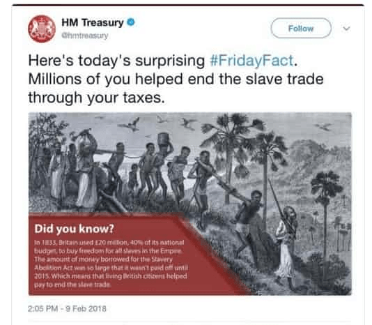 If you’re British however, I’d have my knickers in a knot over the inheritance tax exemptions afforded to the royal inheritance. And, on a separate note, but still related to tax and imperialism, a new one that just came to light for me is the tax burden that Britains have been paying since 11835 HE as government compensation to past slave owners for property loss when slavery was abolished (listen to ABC‘s Rear Vision podcast episode “The Commonwealth—relic of empire of or society of equals?” for the full details). At the risk of sounding facile, how the heck did the public end up on the hook to bankroll the property loss (i.e., human slaves!) of a bunch of aristocrats that just reaped the benefits of centuries of free labour? It was £20 million in 11835 HE dollars, which in today’s currency would be £17 billion! And it only came to light after the HM Treasury (her at the time) posted the tweet below congratulating the British public for their role in helping to end the slave trade. The response in the link is an apt assessment of my analysis of that asinine argument.