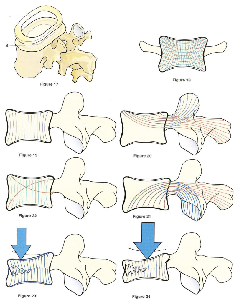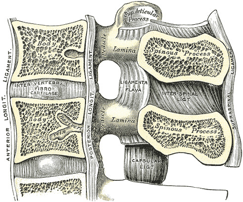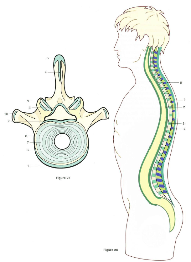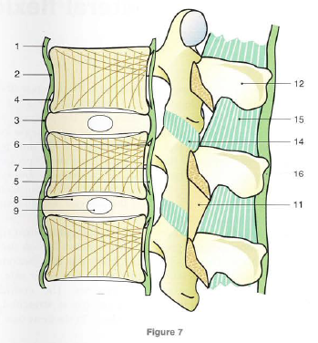Image 4: (1) anterior longitudinal ligament, (2) posterior longitudinal ligament, (3) ligamentum flavum, (4) interspinous ligament, (5) supraspinous ligament, (6 and 7) concentric layers of the annulus fibrosus, (8) nucleus pulposus, (9) anterior and posterior ligaments of the zygapophyseal joint capsule, (10) intertransverse ligament