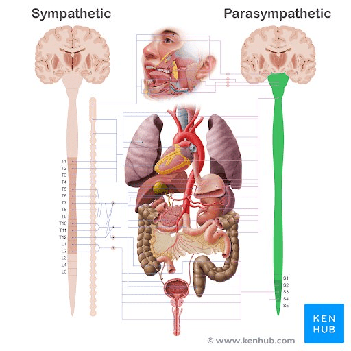 It is likely that the different patterns arise from individual differences in anatomy and sensory processing. A hypothesis is that referred pain results from neural convergence, where individual neurons receive input from many neurons within a network. While it is difficult to distinguish between viscerosomatic (i.e., referred pain) and somatic pain there are some general guidelines. True visceral pain tends to be a diffuse and poorly defined sensation and is often associated with marked autonomic phenomena (e.g., pallor, profuse sweating, nausea, gastrointestinal disturbances, changes in body temperature, blood pressure, and heart rate). The schematic below shows the two main divisions of the autonomic nervous system, the sympathetic and parasympathetic nervous systems (the third division is the enteric nervous system). The sympathetic nervous system is commonly referred to as the “fight or flight” system and the parasympathetic nervous system as the “rest and digest” or “feed and breed” system. The figure below highlights the autonomic innervation of the viscera. Noting the connections and general fight or flight and rest and digest roles of the respective systems helps to explain the associated autonomic phenomena of visceral pain listed above. A feature of visceral pain is that it can sensitize somatic tissues and thus alter their function, which is the implication for SUP biomechanics and the rationale for the inclusion in this discussion.