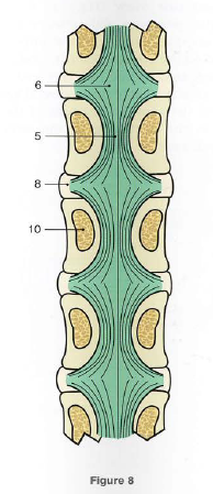 (1) Anterior Longitudinal Ligament, (2) Posterior Longitudinal Ligament, (3) Ligamentum Flavum, (4) Interspinous Ligament, (5) Surpaspinous Ligament, (6-7) concentric layers of the Annulus Fibrosus, (8) Nucleus Pulposus, (9) Anterior and Posterior Ligaments of the Zygapophyseal Joint Capsule, (10) Intertransverse Ligament