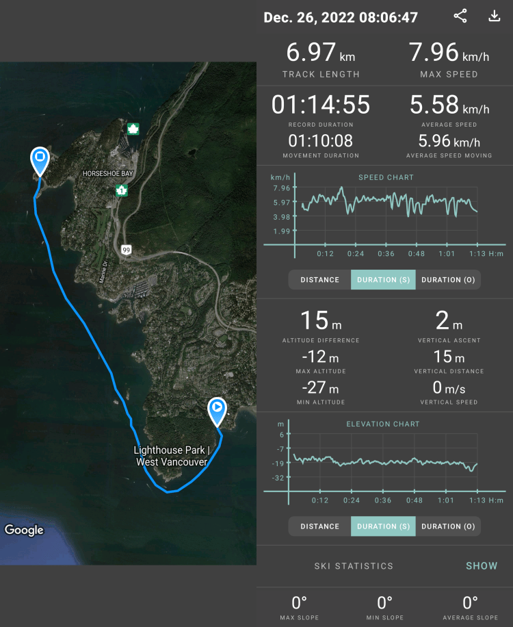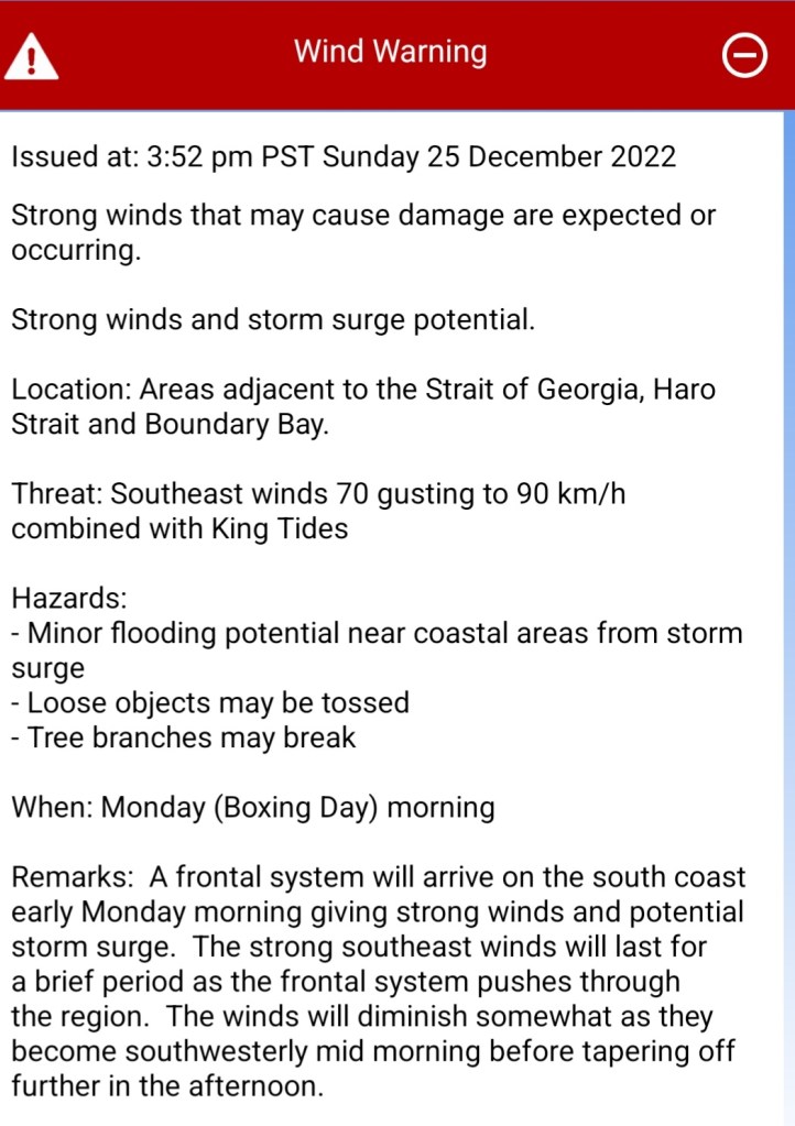 So, when my WeatherCAN app alerted me to “Southeast winds 70 gusting up to 90km/h combined with King Tides,” I was excited (see image below for details). I was already planning for a Boxing Day paddle. It is always enjoyable to get some physical activity after the gluttony of the Yuletide feast and festivities. The question was just where to paddle? We were staying in North Vancouver at my in-laws’ place so my close options were Səl̓ilw̓ət (Burrard Inlet), Səl̓ilw̓ət (Indian Arm), or Átl’ḵa7tsem (Howe Sound). I had been eyeing the easterly outflows forecasted in Səl̓ilw̓ət (Burrard Inlet) earlier in the week for a potential downwind run from Ambleside to Caulfeild Cove. But with the southeasterly winds forecasted to turn into southwesterly winds mid-morning, I wondered if I would be able to launch from Caulfeild Cove, round Point Atkinson, and downwind the Queen Charlotte Channel (click here for the boundaries), at the mouth of Átl’ḵa7tsem to Whyte Cove. The Səl̓ilw̓ət-Átl’ḵa7tsem run.