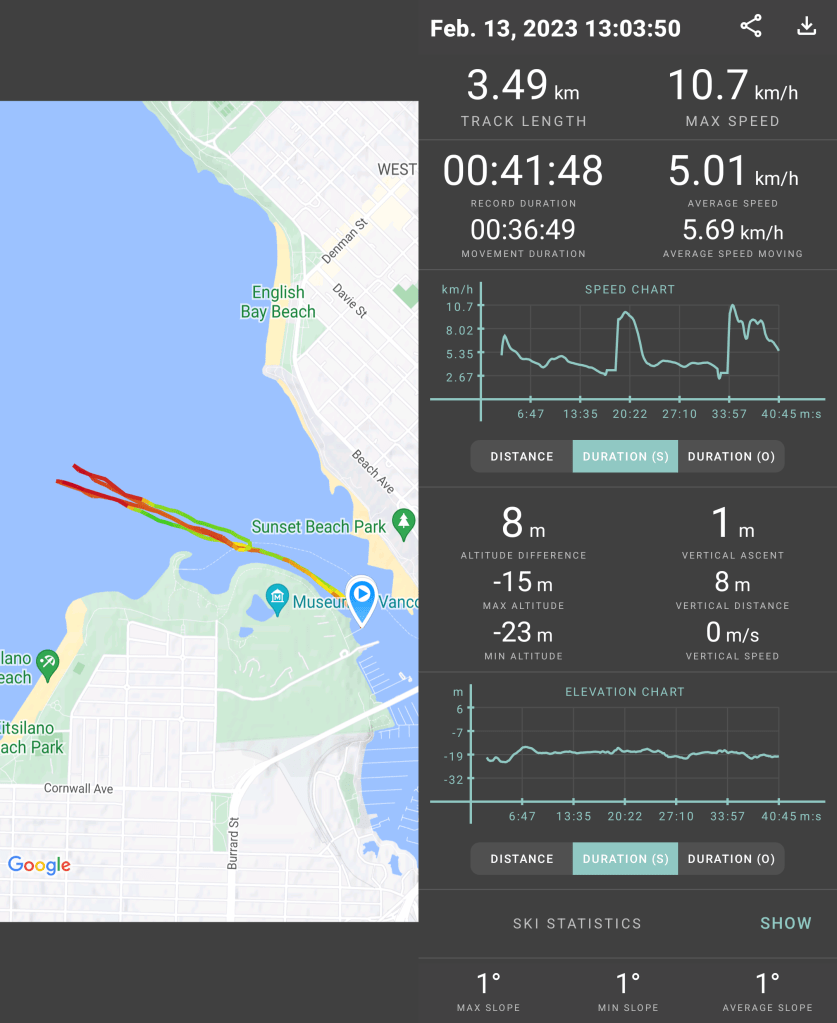 I set my sights on paddling out past the furthest of the moored sailboats at X̱ats’alanexw (Kits Beach) before turning around to downwind. This proved to be enough of a challenge as my right shoulder was already fatigued from rock skipping on the weekend. Despite the DOMS, I deemed the endeavour worthwhile as I managed to set a PB on rock richochets (thanks to Mark Rober and his Rock Skipping Robot video).