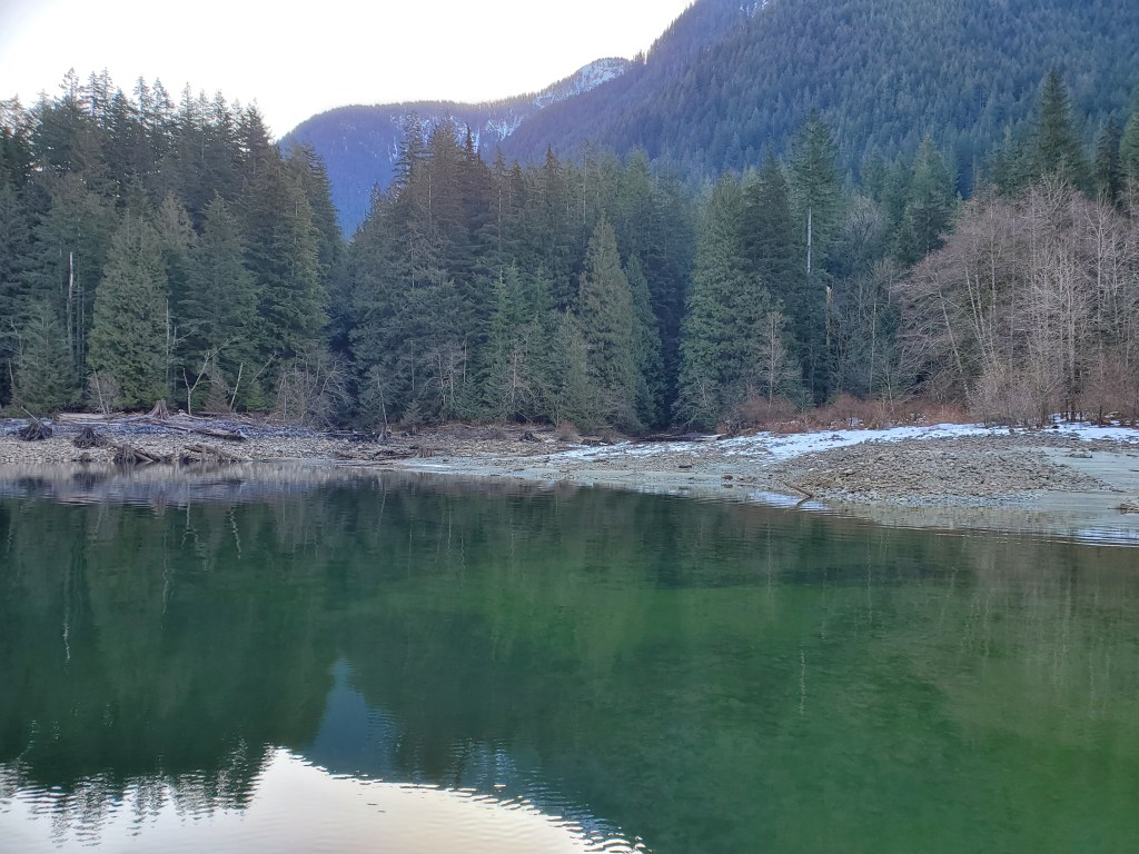 Winter was still in the air and on the ground. The temperature dropped as I felt the coolness of the breeze that accompanied the creek entering Alouette Lake and draining off Mount Crickmer.