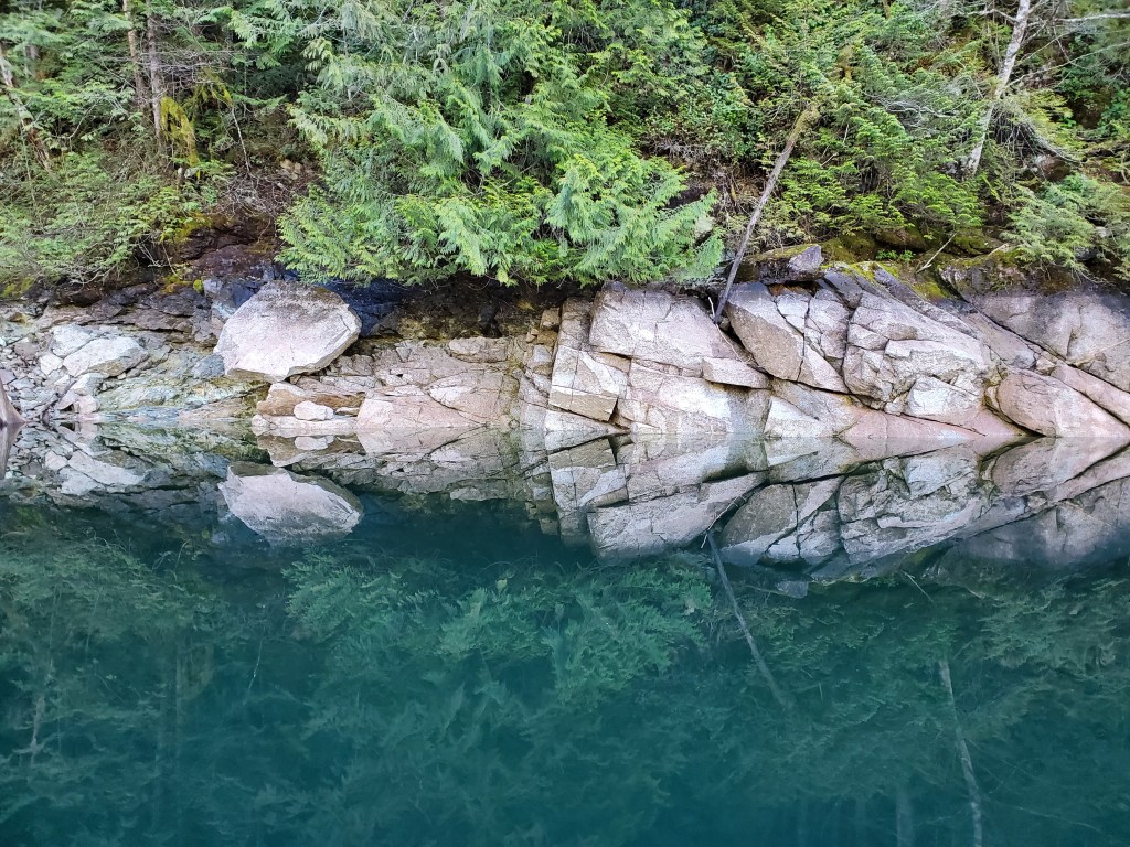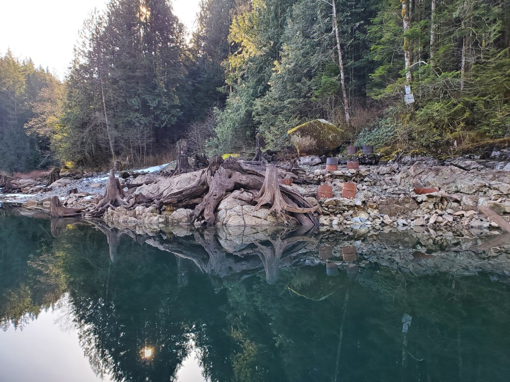I curiously explored the most northeastern reach of the lake, mistaking it for the mouth of the South Alouette River. The photo and 360-degree panoramic video below are from the northeastern corner of Alouette Lake, and of what I thought at the time was the mouth of the south into the lake. I couldn’t go far as there wasn’t much of a waterway. Later, looking at a map I realized that this was a different tributary to the lake from another source. I was left wondering what the lake and delta would look like with higher water levels.