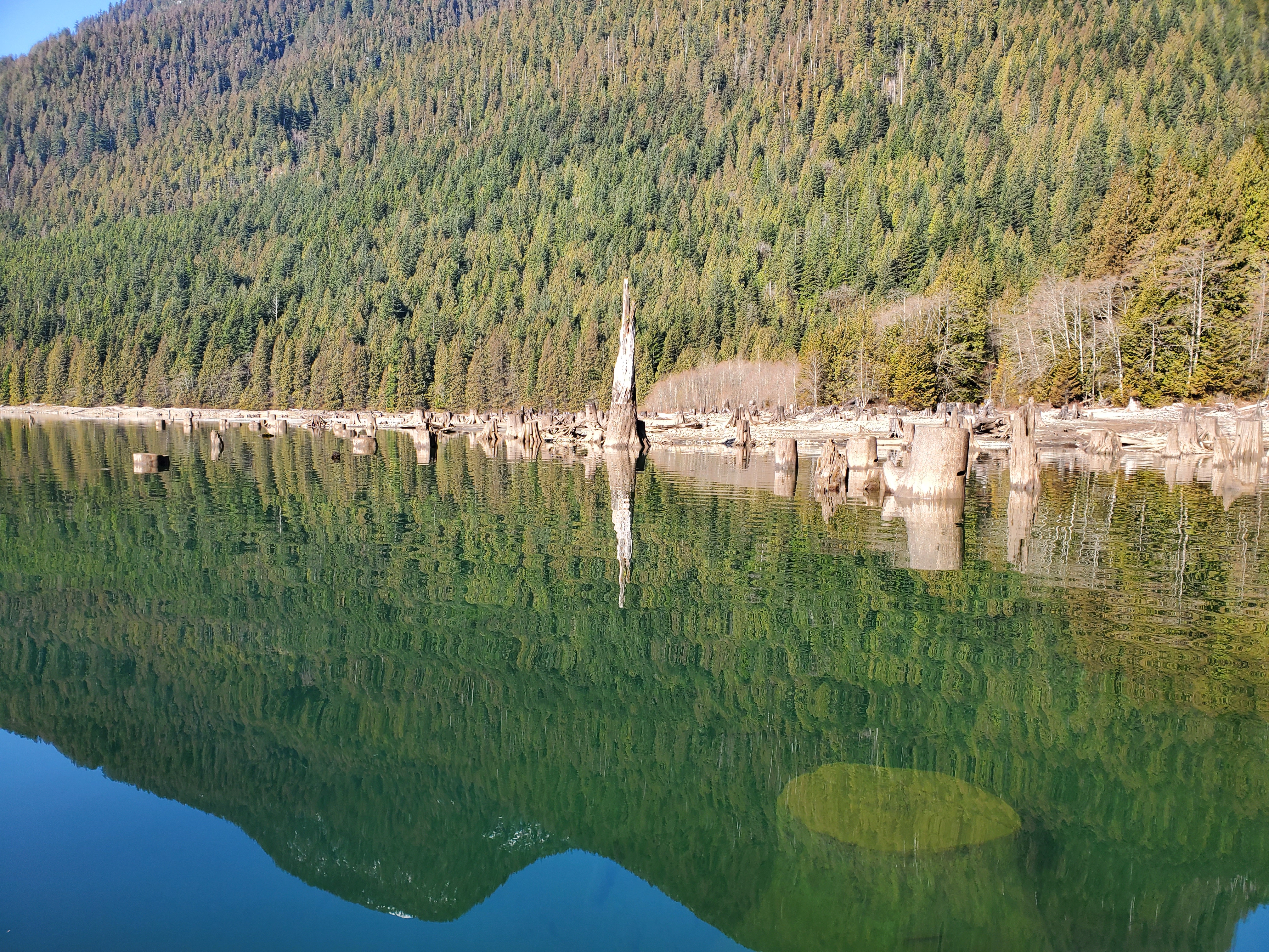 The photo sequence below shows how difficult it was to see beneath the surface. In the first image, you can see a stump sitting just below the surface. While in the second and third images, you can see how the snag appears to be sitting in suspension at the surface. The final image again shows how reflective the surface was.