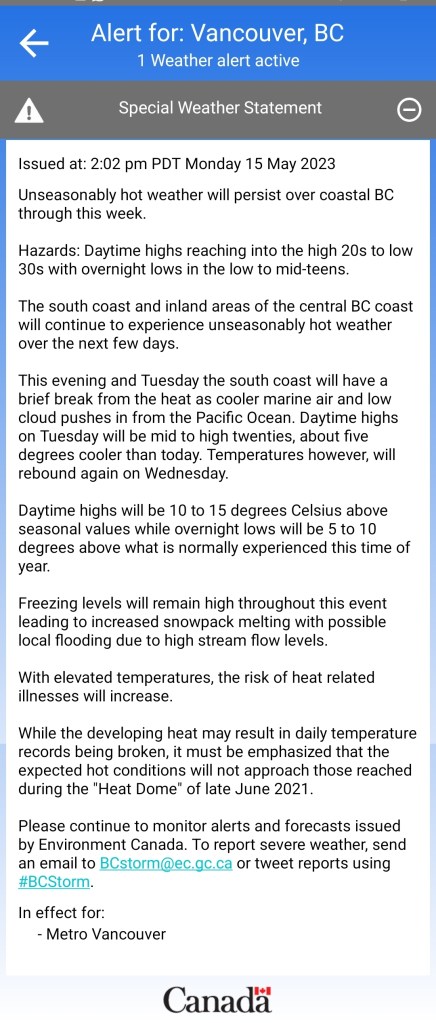 Leading into the weekend, the forecast was looking HOT! Especially with respect to seasonal averages. Environment Canada released a special weather statement preceding the weekend’s heatwave warning of high temperatures 10 to 15 degrees Celsius above seasonal averages. Below is an updated version released on Monday, May 15th.