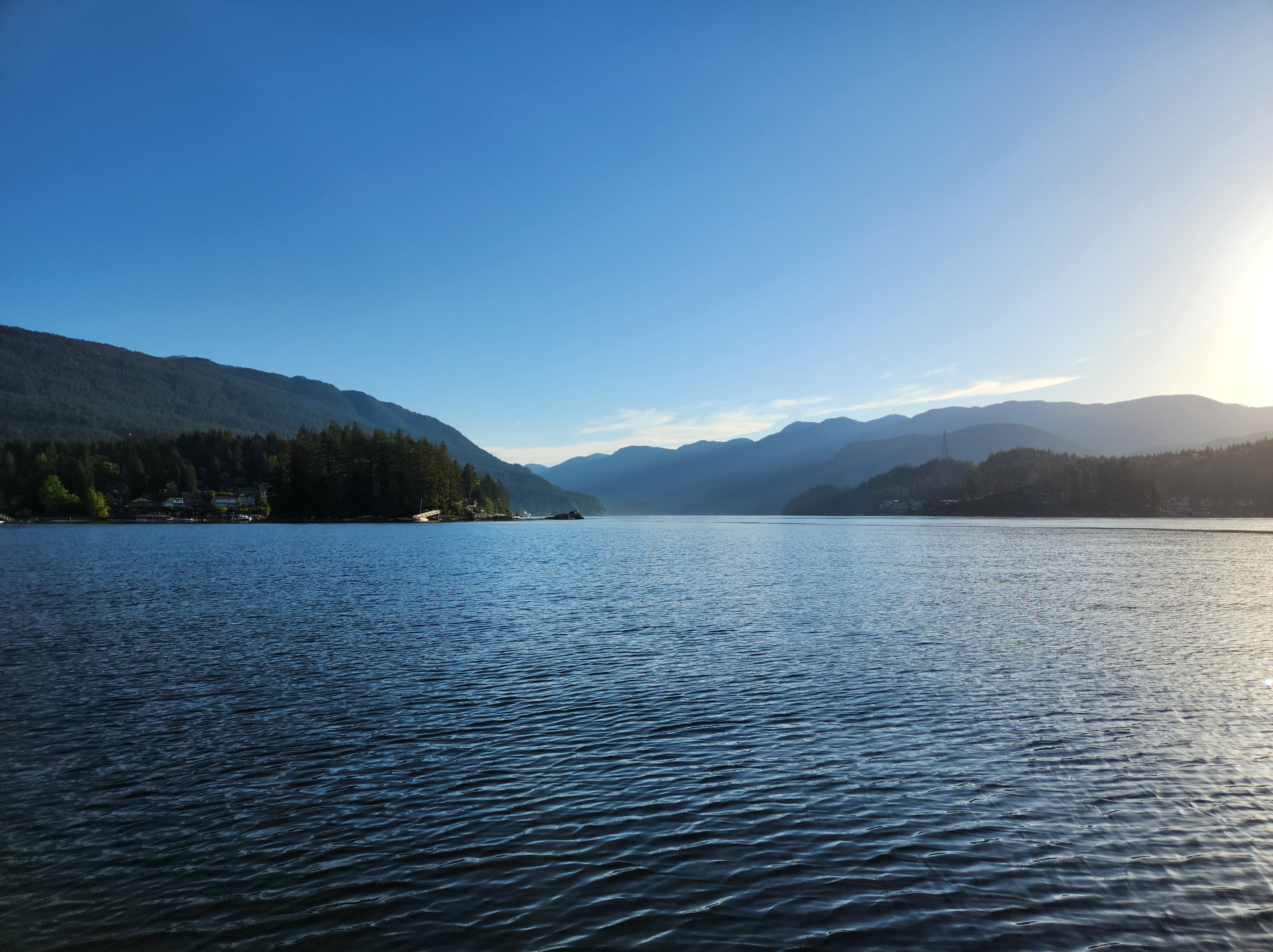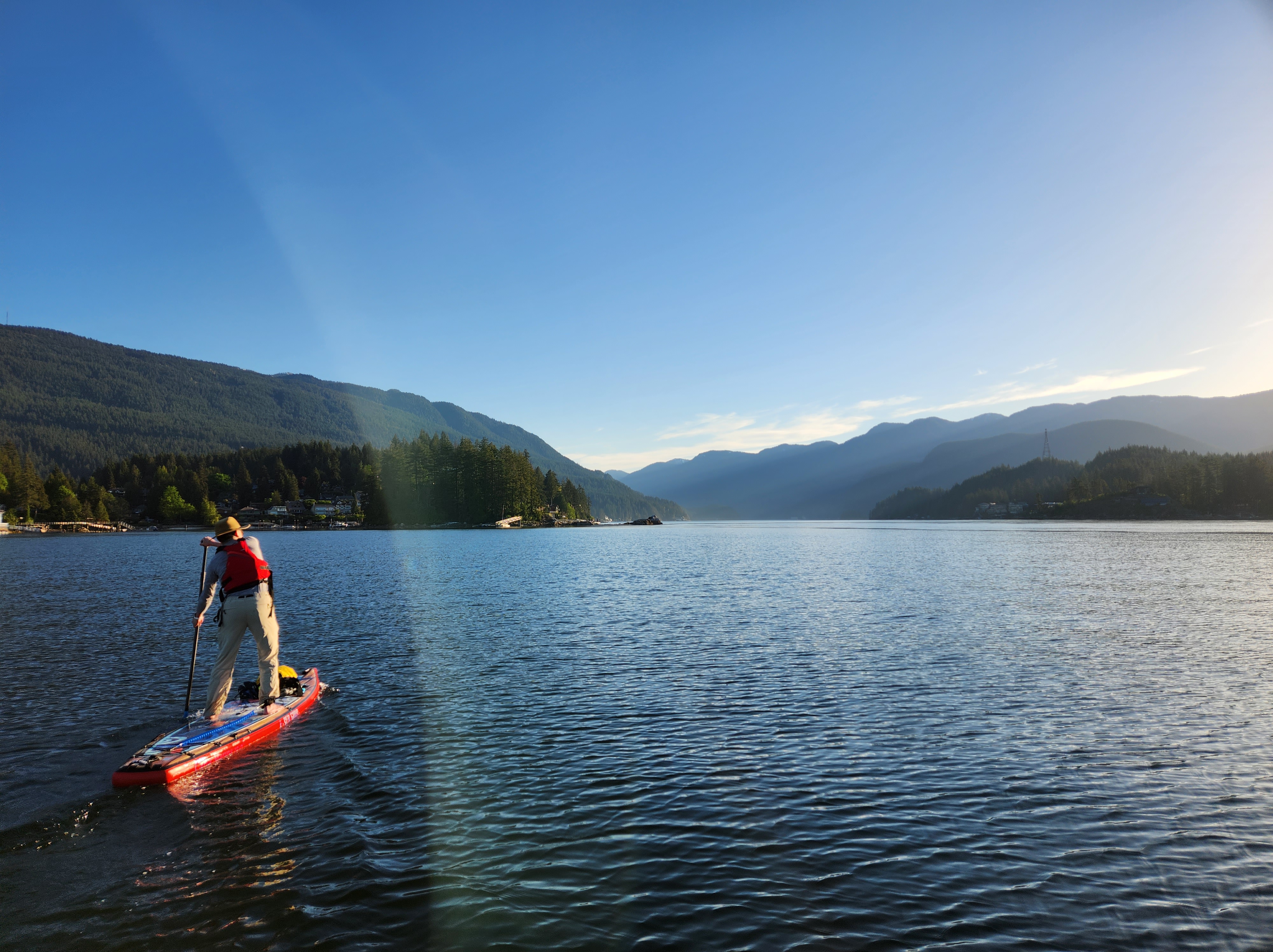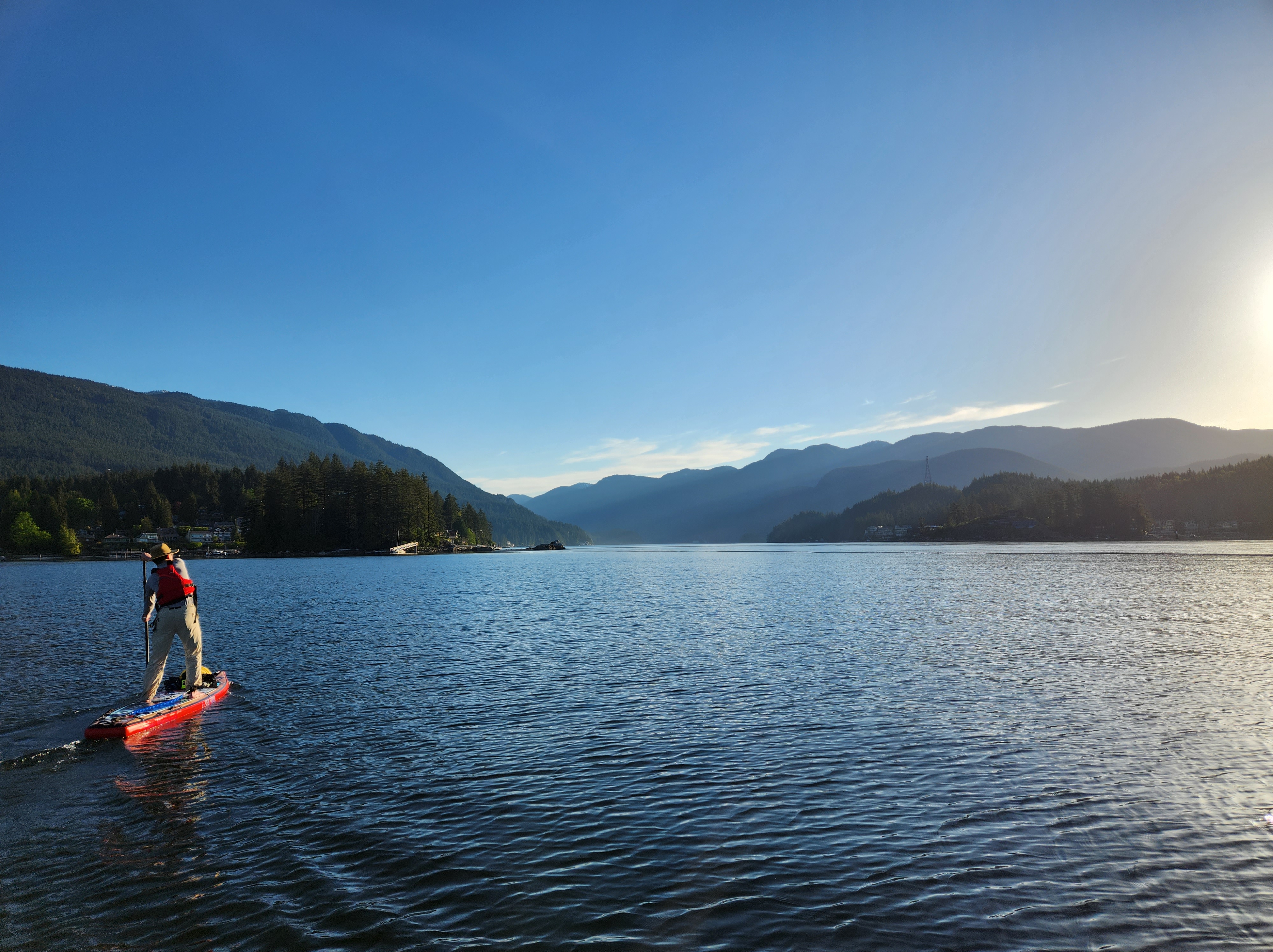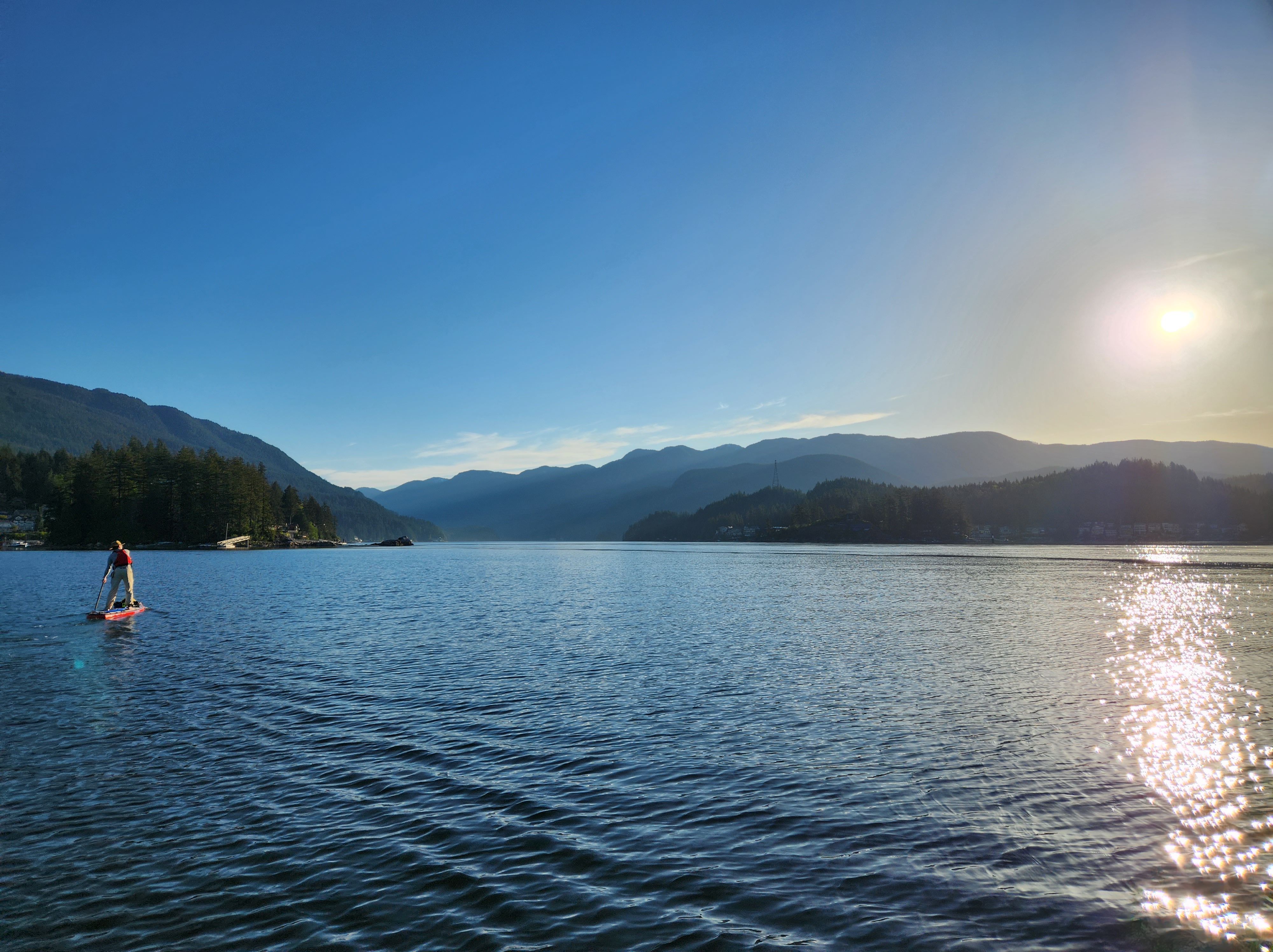 As planned, it was an early start. I arrived at Lowry Waterfront Park a few minutes before 0630 hours. After getting my kit in order, I paused to take in the morning light. With the Sun rising in the east it was shaping up to be a spectacular day of SUP and sunshine. Below is the view from the parking lot looking out over the mouth of Səl̓ilw̓ət (Indian Arm) with Belcarra Bluffs in the background.